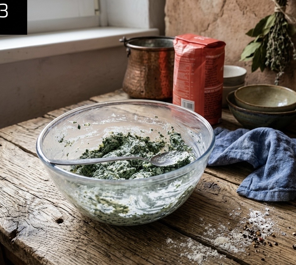 Cozinhe o espinafre, escorra, esprema bem e pique com uma faca. Em uma tigela, junte ricota, ovo, queijo, espinafre, noz-moscada e sal. Misture até obter um recheio homogêneo.