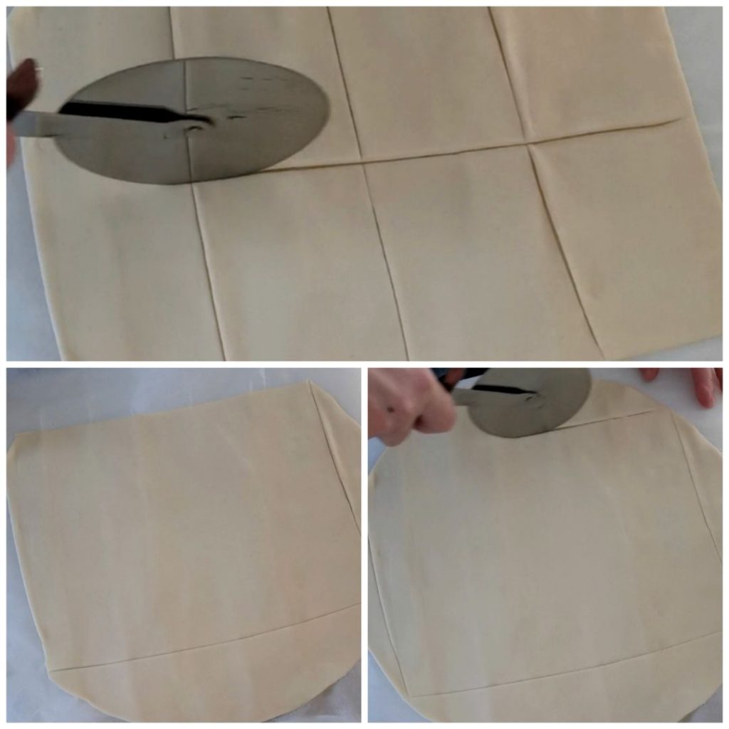 Pegue um rolo de massa folhada, eu tinha em casa o redondo, mas você pode usar o retangular também. Cortei um retângulo e deixei as sobras de lado, vamos usá-las mais tarde. Corte em 8 partes e coloque-as em uma assadeira.