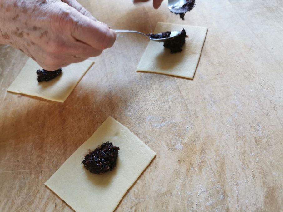 Um conselho, seria melhor preparar o recheio no dia anterior à preparação dos tortelli. Começamos preparando a mostarda cortada em pedacinhos com a meia-lua, e trituramos finamente os amaretti. Colocamos tudo em uma tigela onde adicionaremos as geleias, o cacau amargo e o rum. Misturamos bem os ingredientes com uma espátula, de modo que resulte em uma massa bastante macia