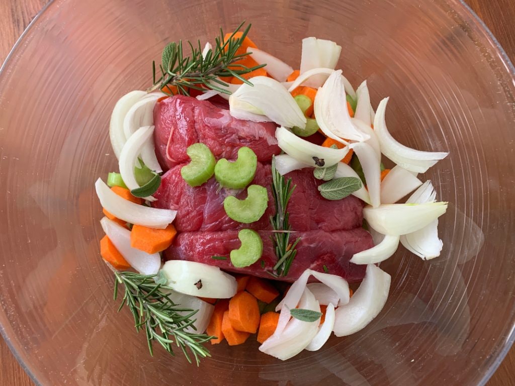 • Coloque todos os vegetais em uma tigela de vidro, adicione o alecrim e a sálvia, depois junte a carne (peça ao açougueiro para amarrá-la ou amarre você mesmo colocando um ramo de alecrim na parte superior).