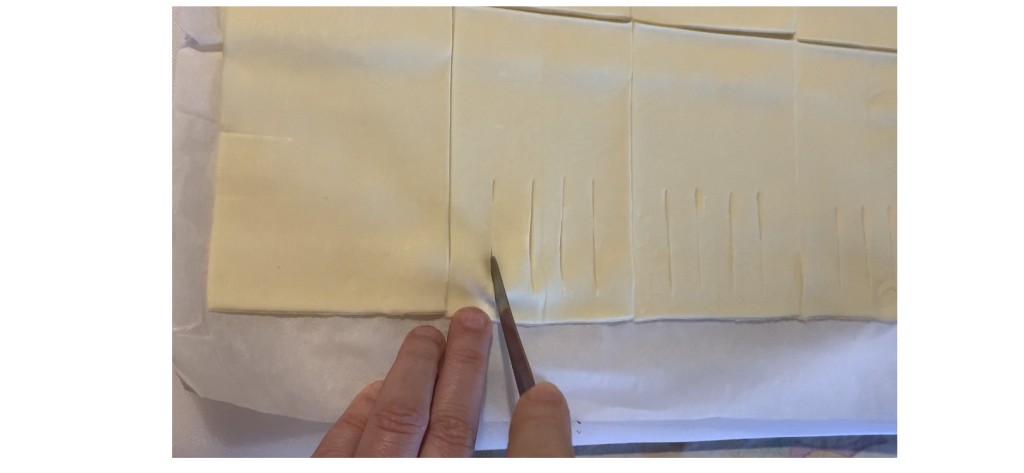 Desenrole a massa folhada e divida-a ao meio no sentido do comprimento, depois divida em 4 partes, para obter 8 retângulos de 8×12.