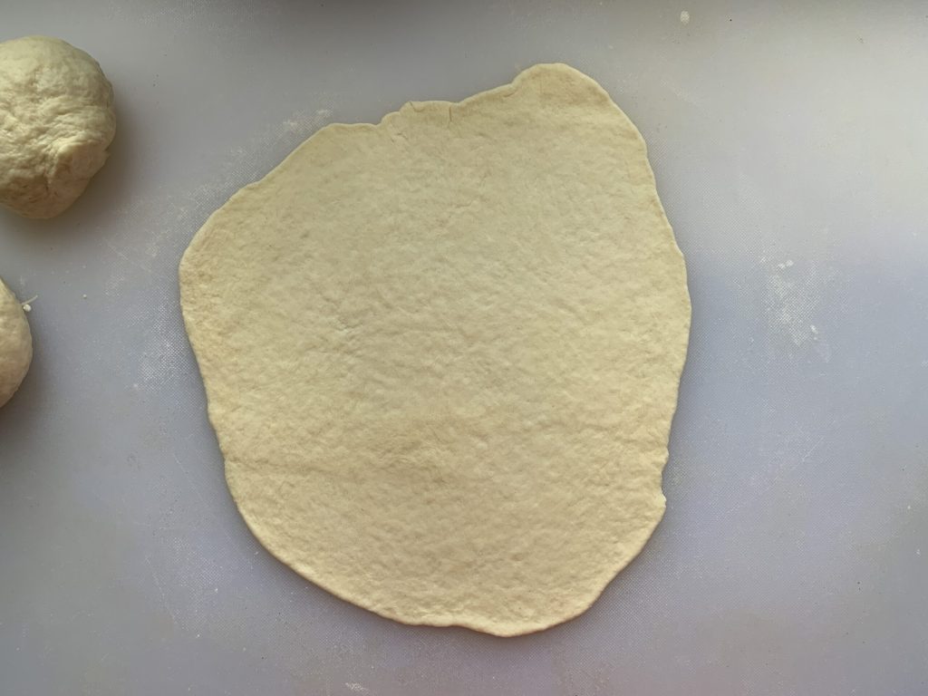 Estenda cada porção em um disco fino de 20-22 centímetros, pincele 1/3 da banha bem macia por cima.