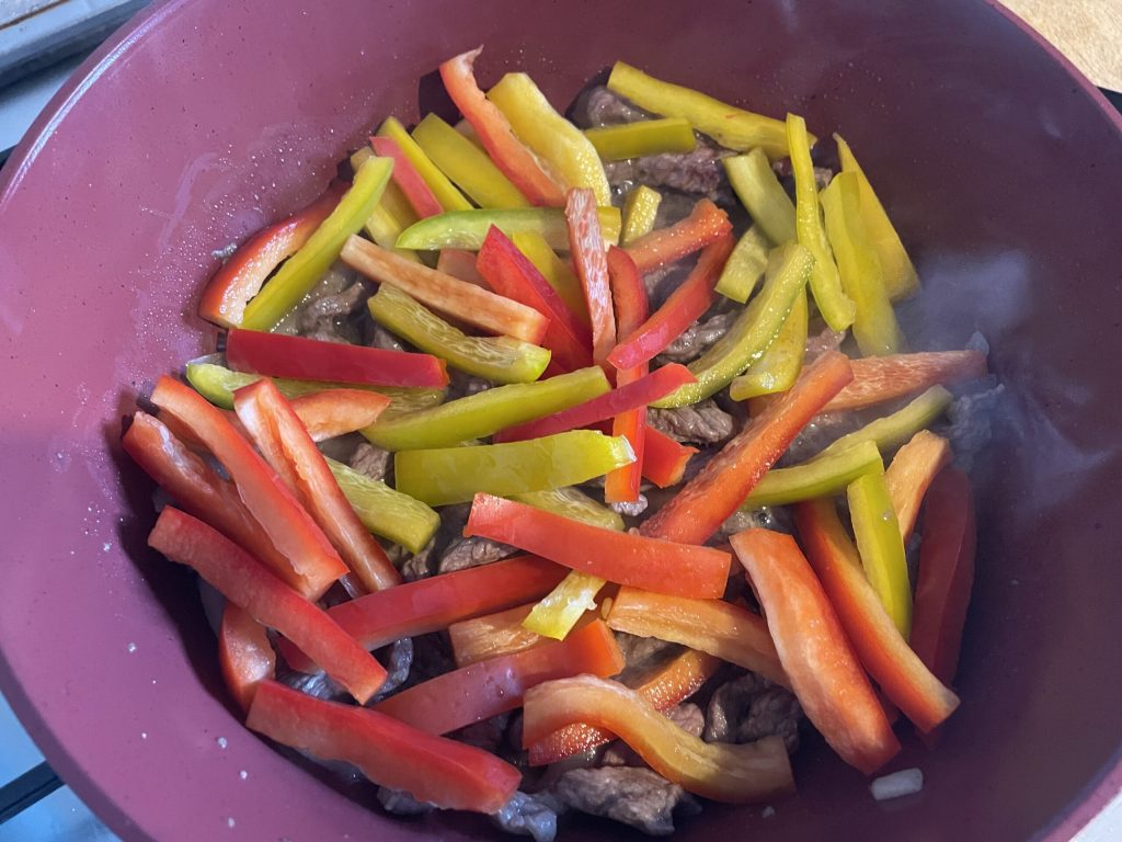Adicione os pimentões e continue a saltear tudo mantendo o fogo alto. Continue o cozimento até que os legumes fiquem ligeiramente amolecidos, mas ainda consistentes.