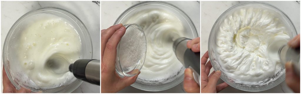 Quando as claras tiverem engrossado, comece a adicionar 85 g de açúcar refinado em fio.
