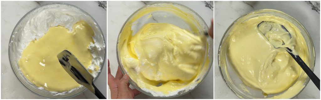 Adicione todas as claras montadas às gemas e continue a misturar para incorporar a mistura, tomando cuidado para não desmontá-la.