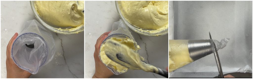Transfira então toda a massa para um saco de confeitar com bico largo liso.