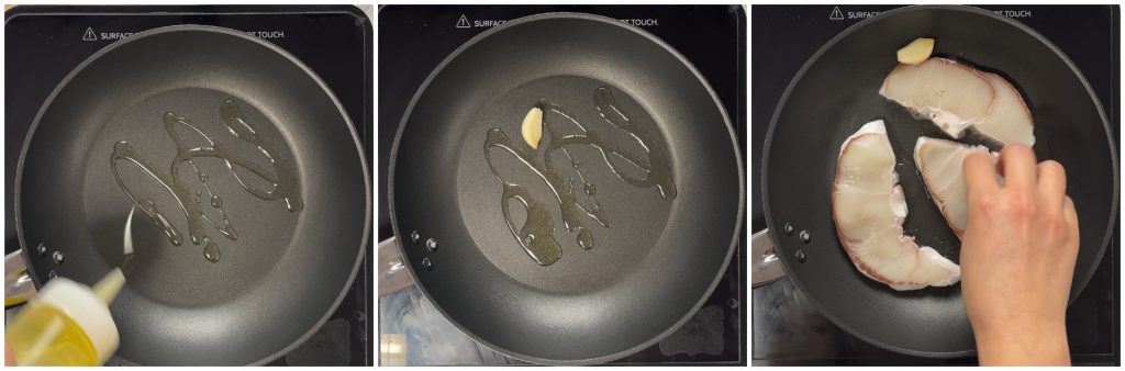 • Aqueça uma frigideira no fogão. Adicione uma generosa quantidade de azeite e o alho descascado e esmagado.