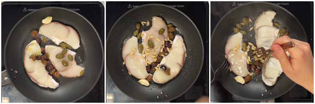 • Cozinhe as fatias de cação por alguns minutos, depois adicione as azeitonas, alcaparras e pinolis.