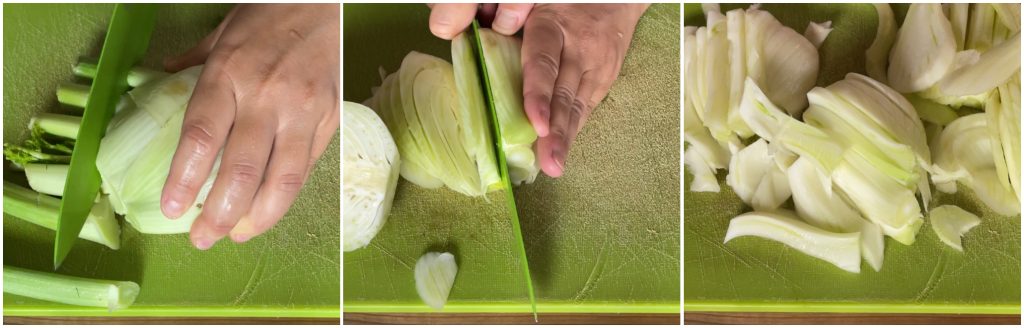 Lave o funcho, retire os topos e fatie não muito finamente.