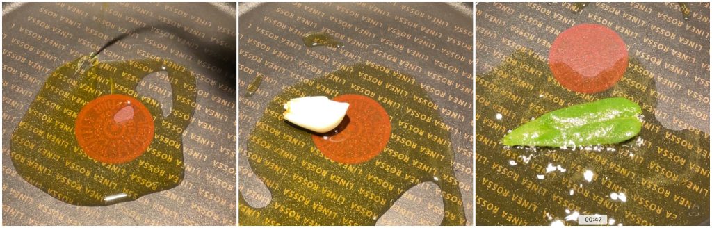 Aqueça um fio de azeite na frigideira, adicione o dente de alho e a folha de sálvia.