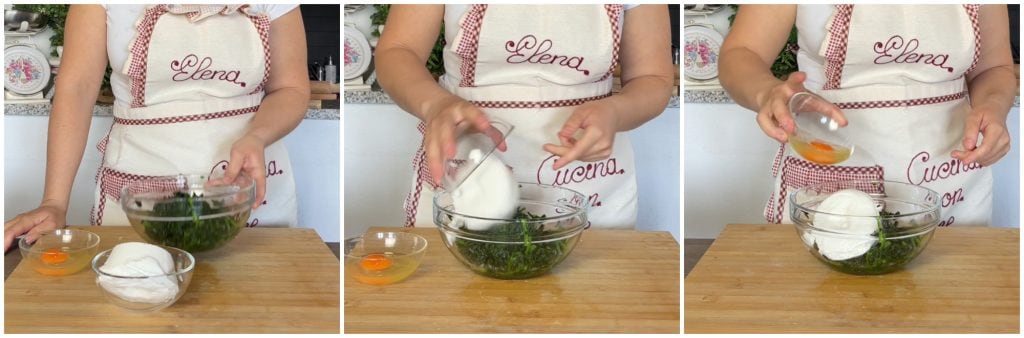 Assim que o espinafre esfriar, adicione a ricota e o ovo.