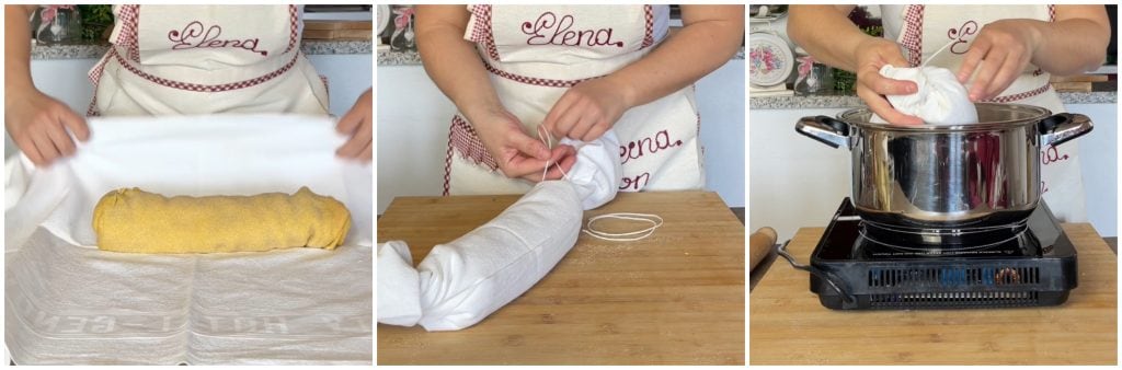 Após 40 minutos de cozimento, escorra a massa e retire imediatamente o rolo do pano, tomando cuidado para não se queimar.