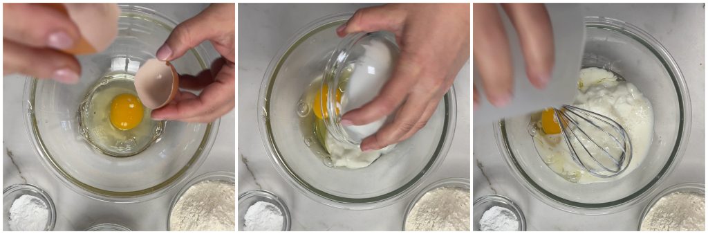 Adicione o iogurte grego e o leite na tigela junto com o ovo.