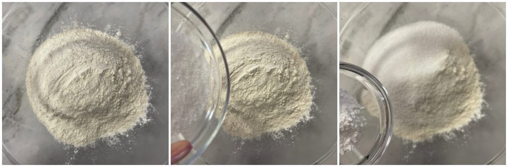 Em uma tigela, coloque a farinha junto com o açúcar e o fermento em pó para doces.