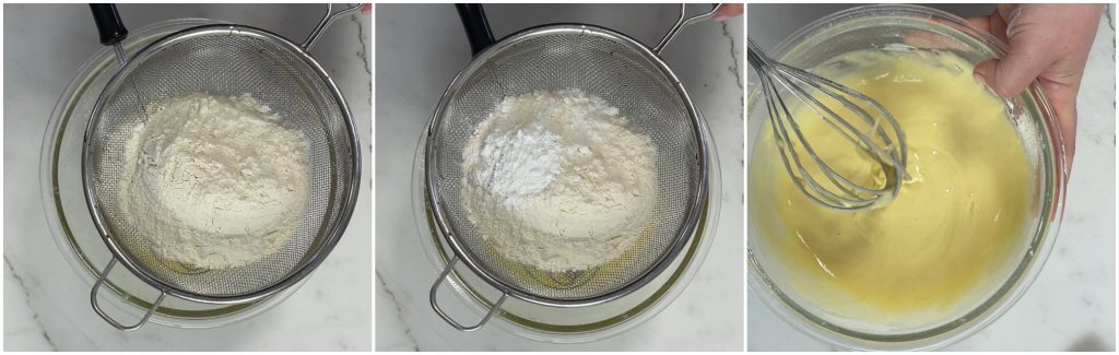 Neste ponto, adicione a farinha e o fermento peneirados e misture energicamente para obter uma consistência cremosa e bastante líquida.