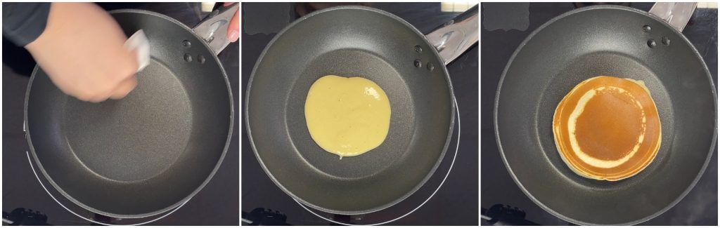 Despeje na frigideira um pouco da mistura para formar uma panqueca de cerca de 10 cm de diâmetro.