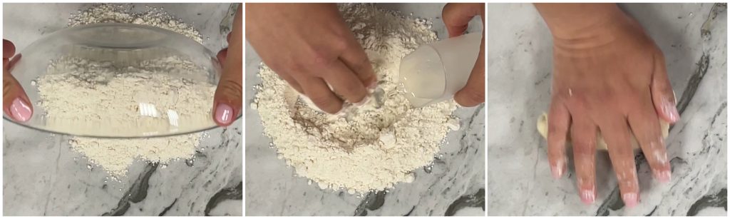 Coloque a farinha em forma de fonte na superfície de trabalho. Faça um buraco no meio e comece a despejar a água no centro. Misture primeiro com as mãos, depois, aos poucos, comece a amassar à mão, cada vez mais vigorosamente, até obter uma massa lisa e homogênea.