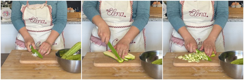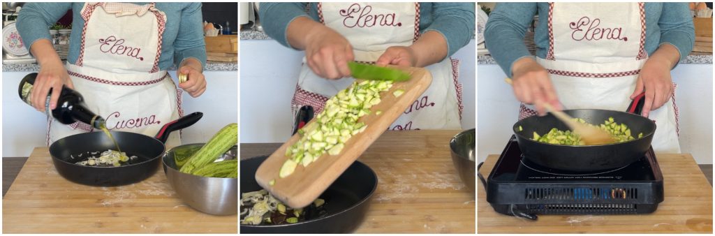 • Despeje um fio de azeite em uma frigideira e adicione a cebolinha e as abobrinhas.