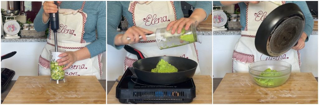 • Quando os vegetais estiverem cozidos, coloque-os em um copo, triture com um mixer e depois transfira novamente para a frigideira para secar o excesso de umidade.