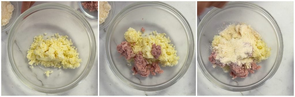 Despeje tudo em uma tigela, adicione o presunto cozido e o parmigiano reggiano ralado.