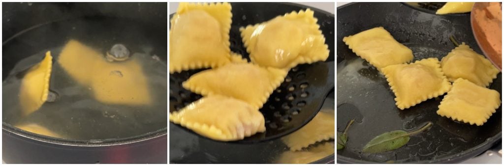 Mergulhe os raviolis, quando estiverem cozidos, escorra-os e coloque-os diretamente na panela onde você derreteu a manteiga junto com a sálvia.
