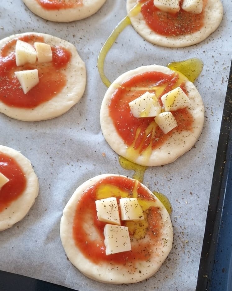 Após o tempo de descanso, estenda a massa. Para as minipizzas, faça um círculo com um cortador de biscoitos ou um copo.