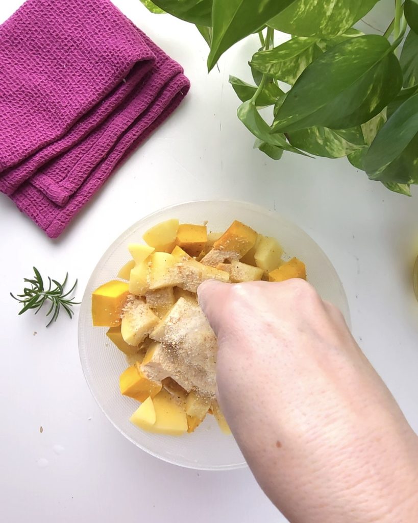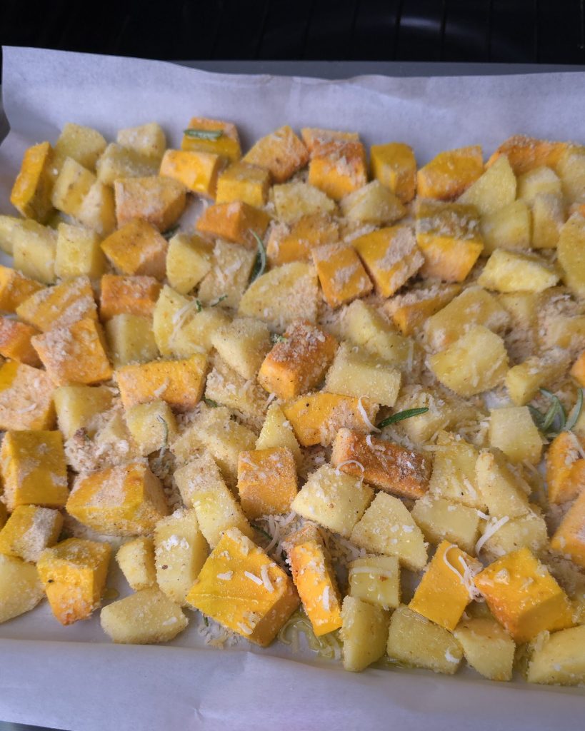 Neste ponto, tempere a abóbora e as batatas com óleo, sal, pimenta, alho, alecrim, farinha de rosca e parmesão ralado.