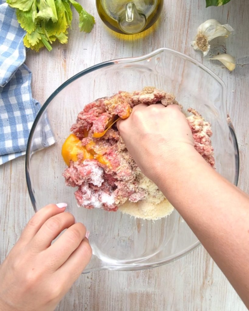 Em uma tigela grande, coloque a carne moída o ovo, o sal, o queijo parmesão ralado, a farinha de rosca e o leite, se necessário, misture bem com as mãos até incorporar todos os ingredientes.