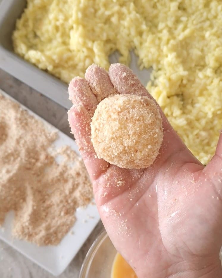 Depois feche bem e empane as arancine passando-as primeiro no ovo batido e depois na farinha de rosca.