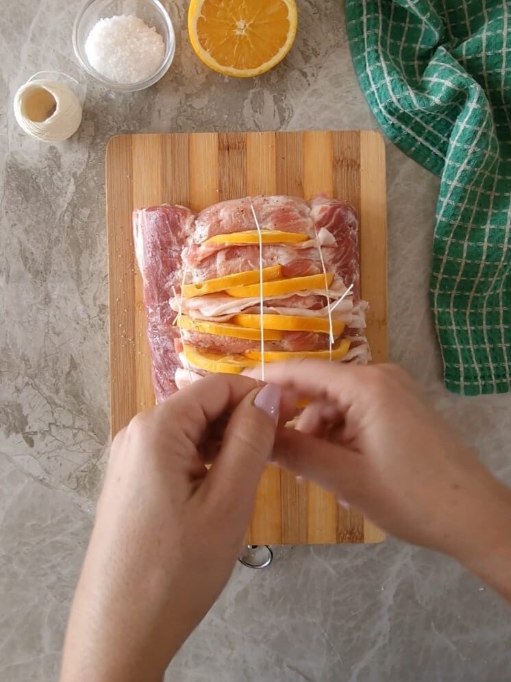 O assado de laranja macio e saboroso pode ser armazenado na geladeira em um recipiente hermético depois de cortado em fatias até o dia seguinte. Como o lombo é uma carne pouco gordurosa, eu recheei com bacon, mas se preferir, pode usar speck. Durante o cozimento, se perceber que a superfície está assando demais, cubra a carne com uma folha de alumínio.