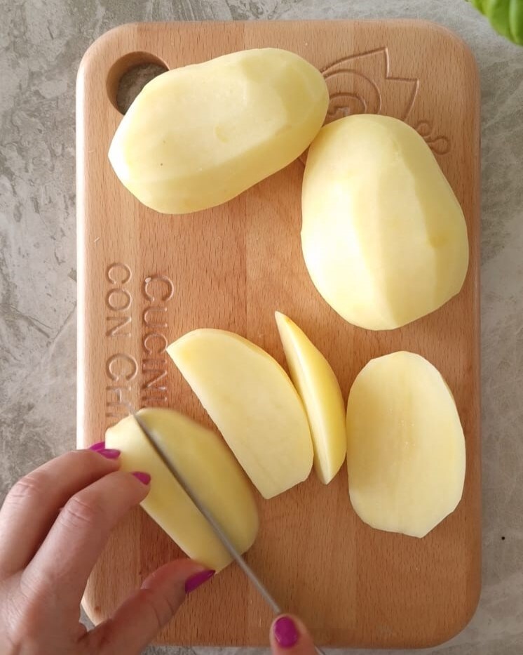 Primeiro, lave e descasque as batatas, depois corte-as em pedaços de tamanho médio.