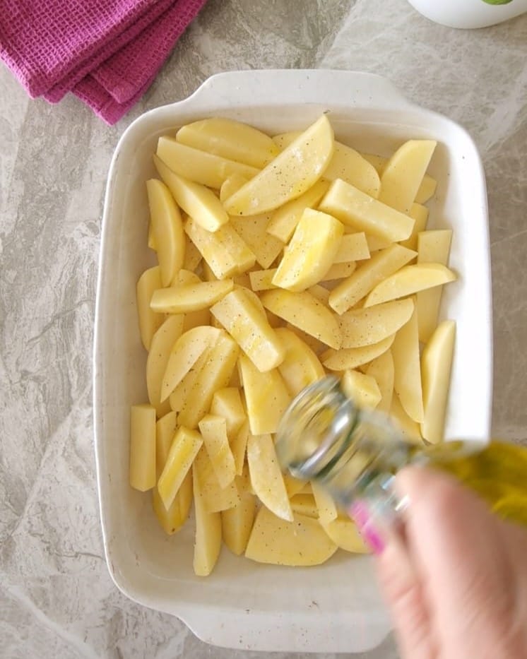 Transfira as batatas para uma assadeira e tempere com sal, pimenta e azeite de oliva extravirgem.
