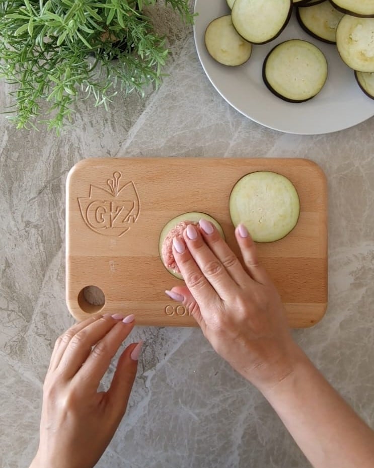 Corte as berinjelas em fatias redondas, em seguida prepare um sanduíche com a carne preparada e feche sobrepondo outra fatia de berinjela.