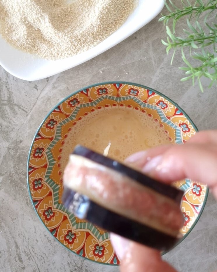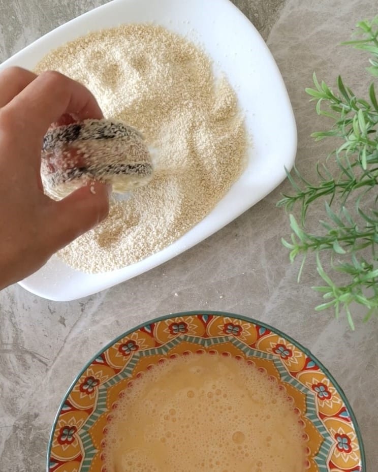 Passe cada berinjela recheada primeiro nos ovos batidos e depois na farinha de rosca.