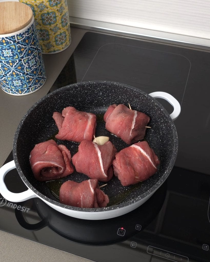 Então, em uma frigideira aqueça o óleo e um dente de alho, adicione as fatias de carne e doure rapidamente para selar a superfície.