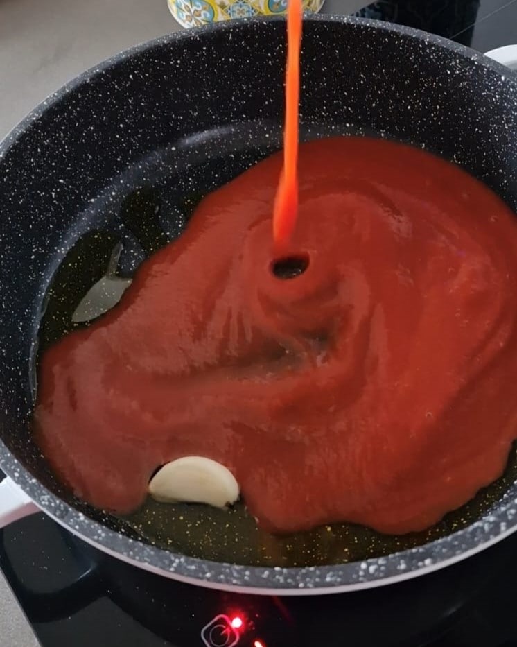Na panela, coloque o óleo e o alho, deixando dourar, depois adicione a passata de tomate, ajuste o sal e tempere com manjericão. Cozinhe por 5 minutos em fogo alto.