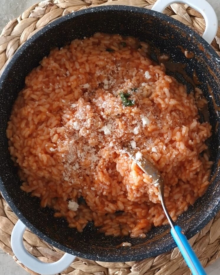 Após o tempo de cozimento do arroz, coloque-o na panela com o molho de tomate, junto com o parmesão ralado.