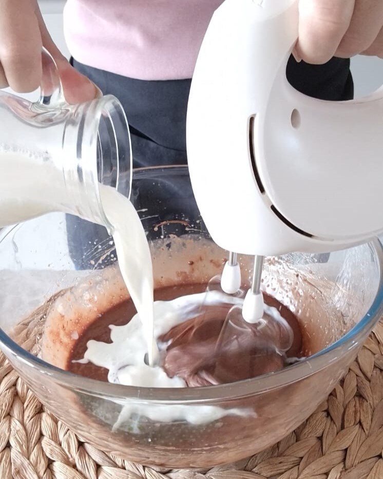 Em seguida, despeje o leite e o óleo, mexendo continuamente, por fim, incorpore as farinhas e o fermento peneirados e misture bem.