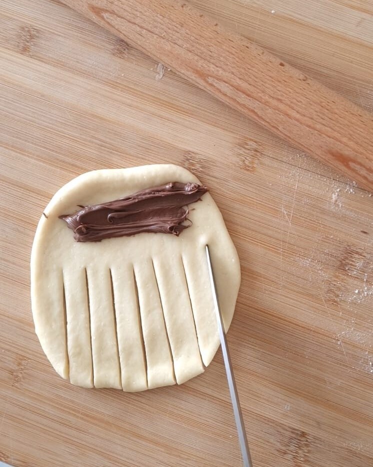 Após o tempo necessário, divida a massa em 9 partes, estenda com o rolo e recheie com Nutella, com uma faca faça cortes verticais.