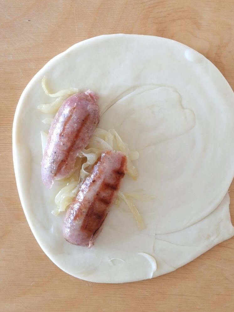 Depois, recheie com as linguiças e cebola.