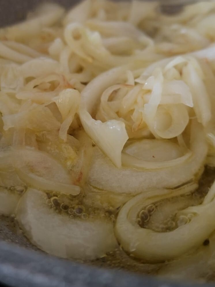 Em seguida, corte a cebola em fatias, deixe murchar na panela com um fio de óleo.