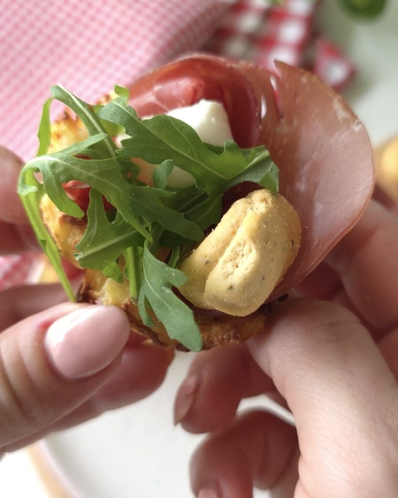 Como último passo, recheie as cestinhas com uma fatia de bresaola, um tarallo e uma mussarela cerejinha. Você pode criar novos recheios de acordo com seu gosto!