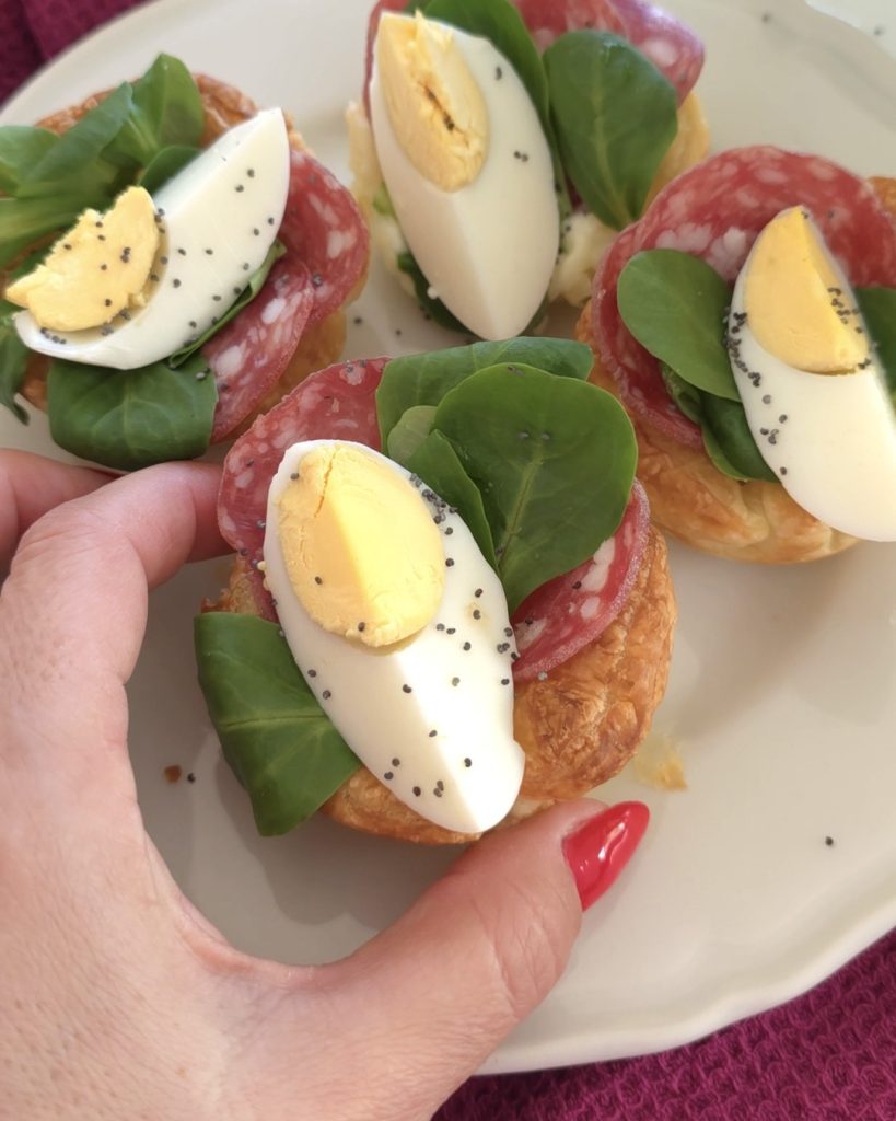 • Recheie com o salame, algumas folhas de alface e o ovo cozido.