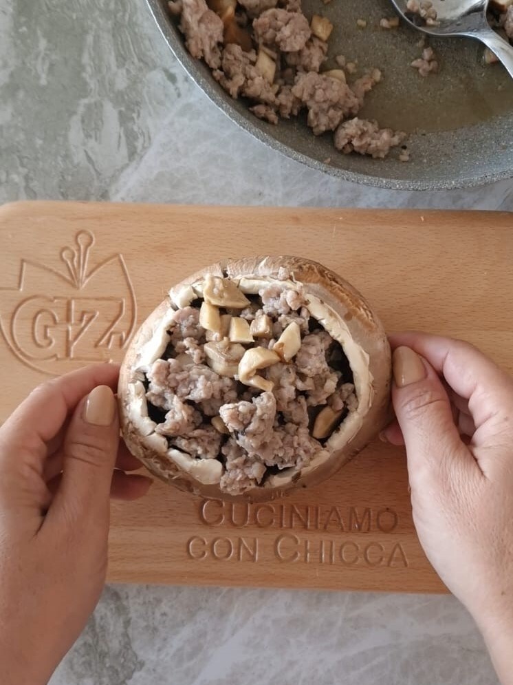 Na minha versão, usei cogumelos Portobello, mas você pode usar os que preferir, até mesmo os Champignon. Você pode adicionar ao recheio uma batata cozida amassada para enriquecer e colocar pedaços de queijo como scamorza ou provolone.