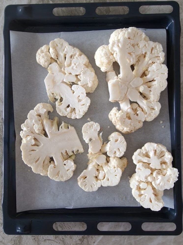 Comece lavando a couve-flor, em seguida, corte em fatias. Transfira as fatias para uma assadeira forrada com papel manteiga.