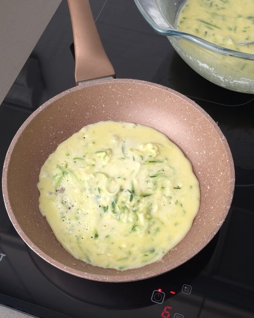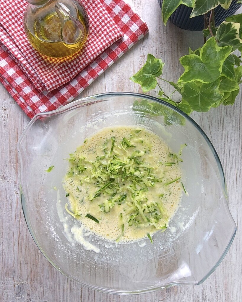 • Em uma tigela grande, bata os ovos, adicione o leite e uma pitada de sal, depois adicione a abobrinha ralada e espremida e em seguida a farinha aos poucos.