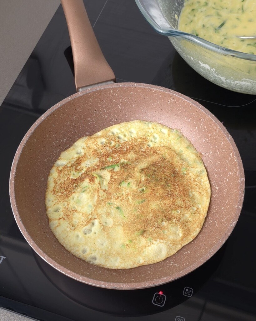 • Aqueça uma frigideira antiaderente e unte-a com um pouco de óleo, depois despeje uma concha de massa, incline e gire a frigideira para distribuir a massa de maneira uniforme.