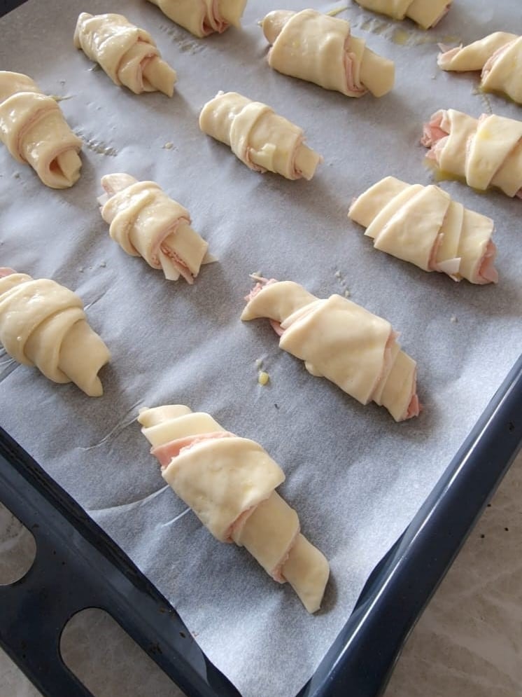 Transfira todos os croissants salgados para uma assadeira forrada com papel manteiga.