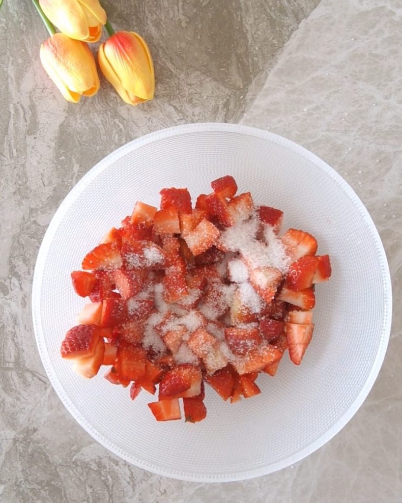 Lave e limpe os morangos, em seguida corte-os em pedaços.