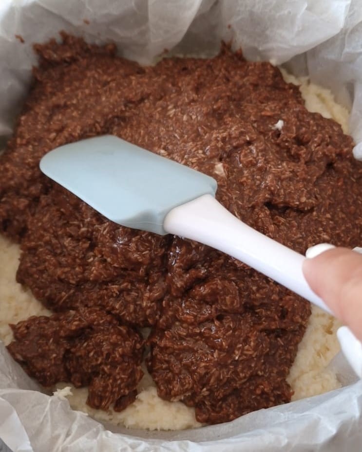 Despeje a primeira parte em uma forma coberta com papel manteiga, enquanto